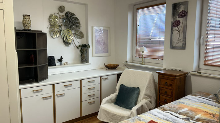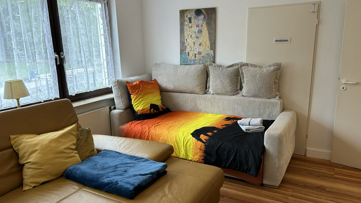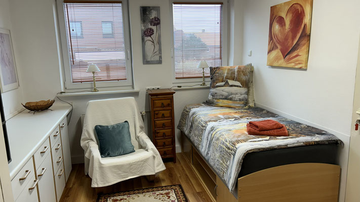 Optional kann bei Bedarf gegen eine Zusatzgebühr ein angrenzender, kleiner 1-Bett-Schlafraum dazugebucht werden. Somit können bei Bedarf 3 separate Schlafräume gewährleistet werden.