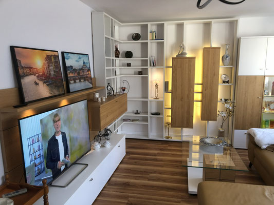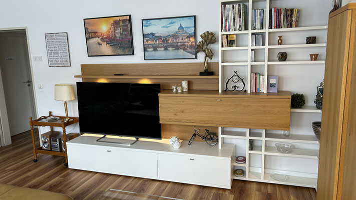 Eine Musikanlage, zahlreiche Bücher, Bilder und Kunstgegenstände in den Regalen geben dem Zimmer einen lebendigen Charakter. Die indirekten Regalbeleuchtungen sowie die dimmbare und geschwungene LED-Deckenleuchte sorgen für angenehmes Licht für die besonderen Momente und Bedürfnisse unserer Gäste. Die elektrischen Funkjalousien garantieren bei einsetzender Dämmerung ihre Privatsphäre und sorgen für Sichtschutz zur Straße.