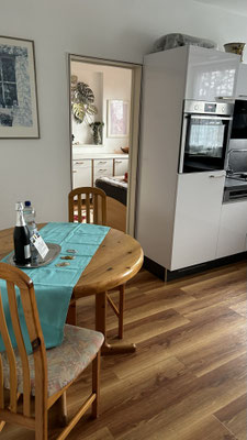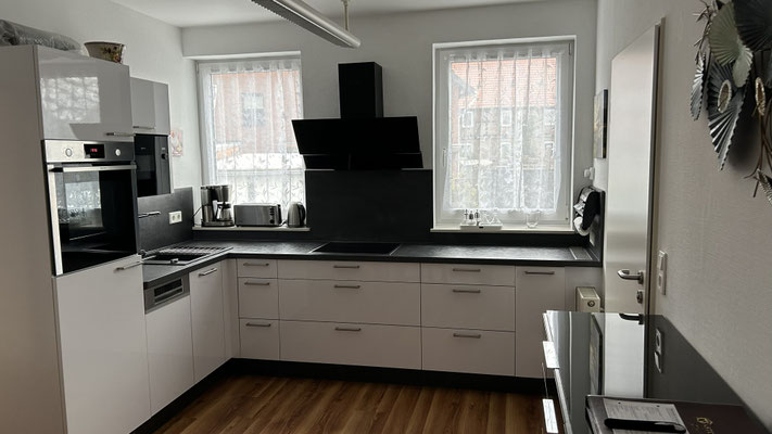 In der geräumigen Wohnküche befinden sich alle Gerätschaften, die zum Kochen und Backen notwendig sind sowie eine gemütliche Essecke mit massivem Holztisch und Stühlen. Die hochwertigen Elektro-Markengeräte von Neff (Mikrowelle, Backofen, Ceranfeld) Miele (Kühlschrank) erleichtern Ihnen die Zubereitung und die Kochgerüche werden über eine große Dunstabzugshaube in den Außenbereich abgeleitet. Und Ihren Abwasch überlassen Sie dem Bosch Geschirrspüler. Beim Blick aus den beiden Fenstern sehen Sie unseren Gemüse- und Kräutergarten.