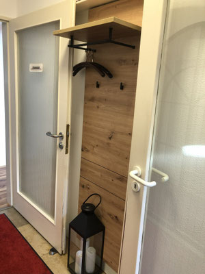 Gegenüber der Garderobe steht ein großer Spiegel bereit.