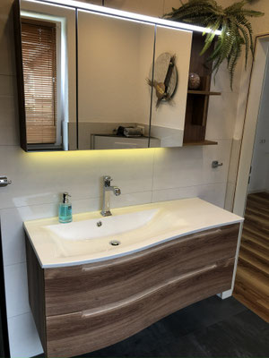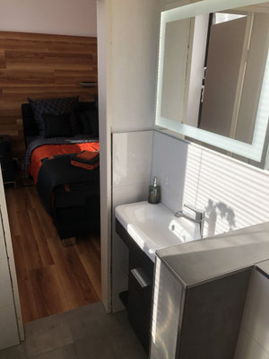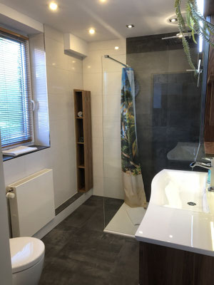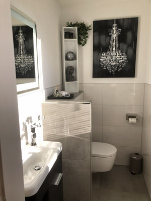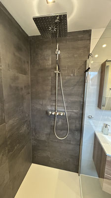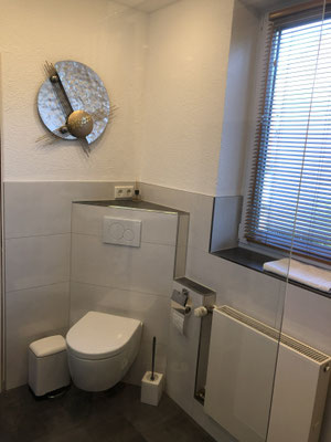 Das moderne, große Badezimmer ist mit multifunktionaler Dusche („Regenwalddusche“), einem großen Waschtisch und einem 2. WC ausgestattet. Hochwertige Wand- und Bodenfliesen runden den schönen Gesamteindruck ab.