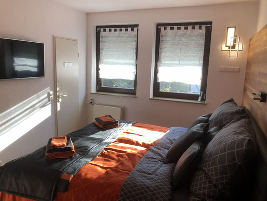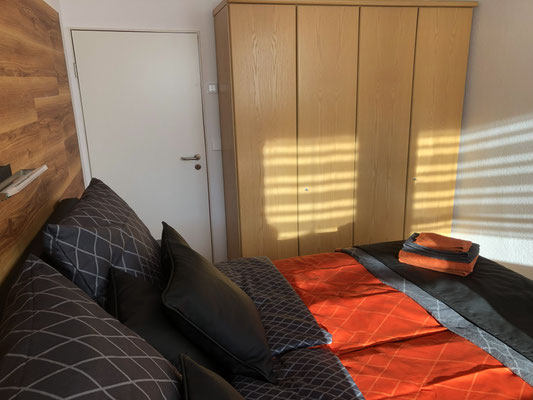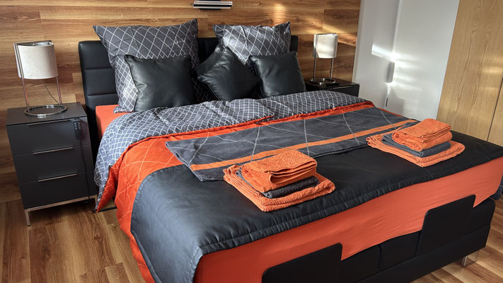 Das Schlafzimmer ist mit einem motorisch gesteuerten Boxspringdoppelbett für optimalen Schlafkomfort ausgestattet. Die Matratzen haben die Härtegrade H2 und H3 zur Auswahl. Ein 40-Zoll Flachbildfernseher mit Internetzugang zu unseren kostenfreien Streamingdiensten wie Netflix, Waipu TV, Prime usw. steht Ihnen zur Verfügung. Ein großer Kleiderschrank bietet genügend Platz für Ihre gesamte Garderobe. Für Langschläfer lassen die elektrischen funkgesteuerten Jalousien an den beiden Fenstern die Morgensonne abdunkeln oder den Blick in einen ruhig gelegenen Garten verwehren. Mit dem Schlafzimmer direkt verbunden ist ein modern eingerichtetes WC mit Waschtisch.